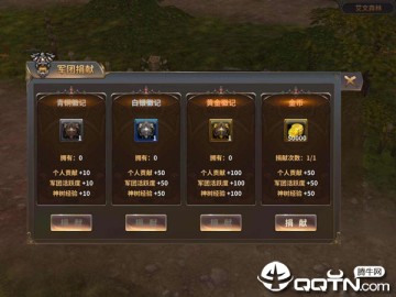 军团贡献度:军团成员可以向军团捐款获得贡献度,捐款分青铜令牌、白银令牌、黄金令牌、消耗金币、4种