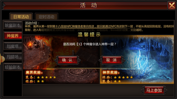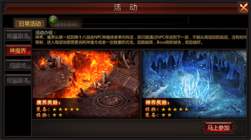【除魔副本】之外,另一个升级的好去处就是【神魔界】。【神魔界】分别是两个进行“经验获取”和“装备获取”的活动副本,神界、魔界分别有9层,神界、魔界从第1层到第9层均有NPC神魔使者单向传送,没有时间限制,进入每层地图需要消耗神魔令或者一定数量的元宝,层数越高,BOSS刷新越快,奖励越好。