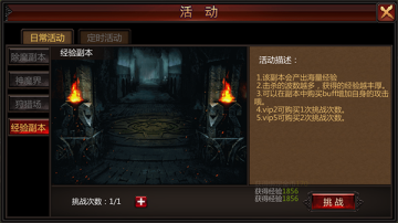 当玩家到达40级后,首先将开启一个活动——【除魔副本】。在《荣耀战争》中,【除魔副本】绝对是每个玩家每天必须参加的活动之一,该活动除了产出大量的经验外,更有丰富的物品奖励。【除魔副本】40级开启,之后每10级解锁一个新副本。分个人和组队两种挑战方式,组队副本比个人副本难度更高,当然奖励也更加丰富。每个【除魔副本】中都有大量的小怪和1个BOSS,击杀掉副本中的所有怪物就可以通关并获得大量经验。