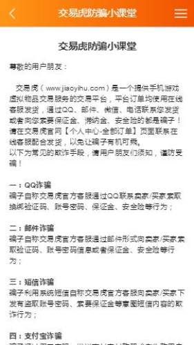 交易虎(www.jiaoyihu.com)是一个提供手机游戏虚拟物品交易服务的交易平台,平台订单均使用在线客服发货,通过QQ、邮件、微信、电话联系您发货或者向您索要保证金、滞纳金、安全险的都是骗子!请在交易虎官网【个人中心-全部订单】页面联系在线客服配合发货,以免让骗子有机可乘。