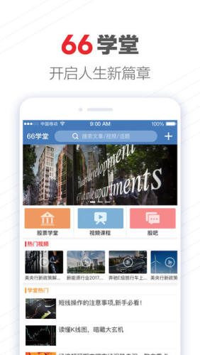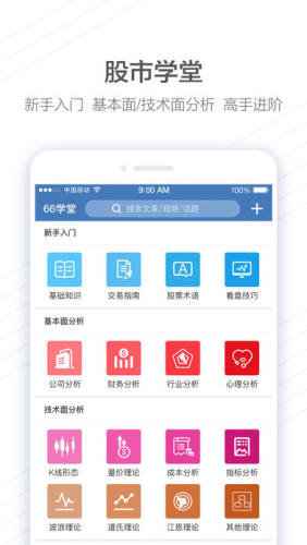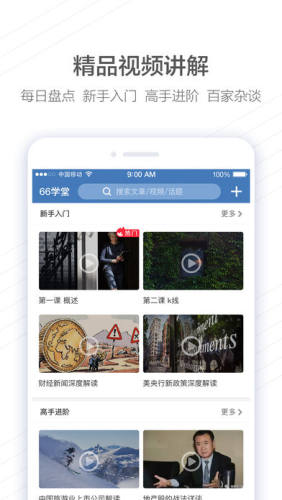 66学堂是集财经,新闻,养生,情感课程于一体的学习交流平台,系统化的视频课程为刚接触股市的股民更高效快捷的学习股票知识技术,同时还有各种养生,心态,事业解读视频,实时更新。