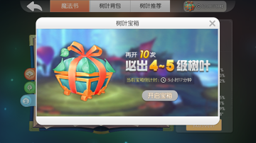 游戏内每隔一定时间赠送树叶宝箱,开启宝箱可以获得随机等级及种类的树叶。每开启10次宝箱,必出4~5级树叶。