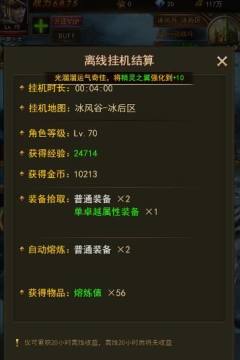 如上图所示,根据玩家离线的时间以及地图,会获得经验、金币、装备的奖励。