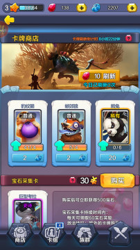 根据战场等级开放的卡牌,以及攒下来的宝石,可以根据需求,在商店出购买宝箱,来加强自己的卡组,但是在新手前期阶段,还是建议通过宝石换金币,来提升自己的主力卡组。