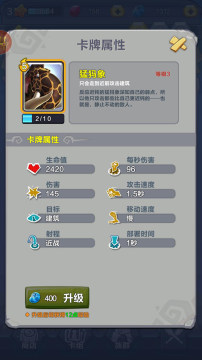 卡牌界面展示了当前拥有的卡牌的属性(生命、伤害、攻击范围以及卡牌当前等级等),每个卡片的介绍可以让玩家快速明白它的基本用途,从而搭配属于自己的卡组。