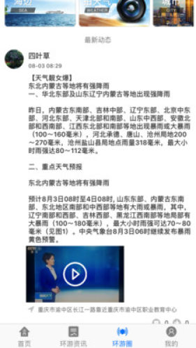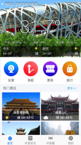 环游气象app是一款综合生活服务软件,提供实时天气查询和预报功能,对景区和高速路况可实时视频查看,还能帮你订票订酒店,出行或旅游,有它就够了。