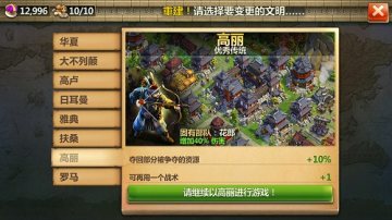 高丽民族的特色在于进攻和资源发展上均有偏向,其特长是可以夺回部分被掠夺的资源,能够更好的保证自身的发展。在进攻战斗中还可以额外使用一个战术,往往是决定的胜负的关键。固有部队:花郎,特点增加40%伤害,最强悍的远程兵种之一。