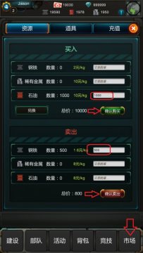 点击右下角的市场,可以进入资源交易界面,上方可以卖出多余的资源,下方可以买入缺乏的资源。买入与卖出都是以现金为中间等价物进行交易的。当然买入和卖出之间有一定的差价。每日买卖的次数和数量都不受限制,玩家可以在自己需要的情况下随时买卖资源。