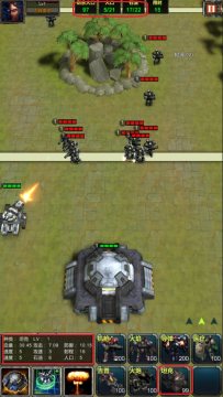 将游戏界面向下拉,可以看到自己基地和血条,我们的目标是在我方基地被干爆之前,干爆敌人的基地。为了实现这个目标,派上我们的部队。下方红框的坦克,点一下,坦克就会出现在基地的前方,部队上阵后就会自动开战,看戏就行。部队图标的右下角数字代表该兵种你拥有的数量,用光了就要造。爱兵如子才是好指挥官。