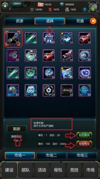 最后 ,当玩家制造某些兵种缺乏道具的时候,可以在市场的道具商店进行交易,道具市场支持现金和钻石两种报价方式购买,每4小时道具市场刷新一次,也可花费钻石手动刷新。
