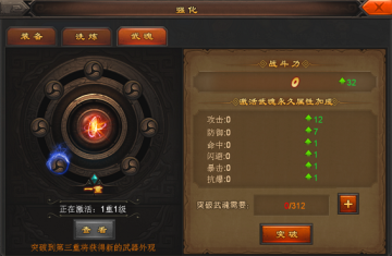 当玩家达到30级时,即可点击主界面的【强化】按钮进入强化界面,点击【武魂】标签页即可打开武魂界面了。拥有足够的武魂值时,即可点击界面中的【突破】按钮进行突破,突破武魂不仅能增加玩家的属性,更能拥有炫酷的武器外观。