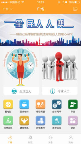 全民互相帮忙。有空闲时间的生活达人或者有专业技能的用户可以帮助有需要的用户,赚取佣金。需要帮忙的用户可以根据自己的需求寻找附近愿意帮忙的人。包括跑腿办事,球类教练,律师咨询,心理咨询,减肥指导,健身教练,美食品鉴,电影品鉴,上门spa等服务。