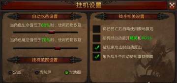 第二步:在游戏挂机设置里设置相应的选项,根据人物属性等级设置使用药物恢复的时间以及战斗的相关设置。