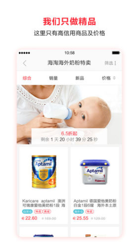 母婴海淘是一款专注于母婴用品选购的app,使用母婴海淘,能够让你买到更加放心的母婴用品,让你的孩子吃的、穿的、用的更加安全。有需要的朋友快来下载试试看吧!