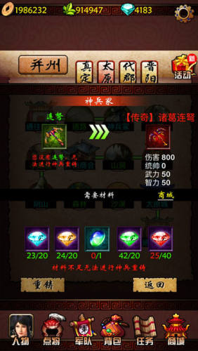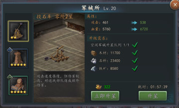 主公府12级解锁,研究军械的建筑,军械包含井栏,投石车,战鼓三种,主要用于针对不同战场需求发挥不同作用,提升等级可加强军械威力