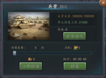 生产士兵的建筑,提升等级可以增加武将的带兵上限,士兵存储上限和单次招募士兵的上限;招募士兵需要消耗时间以及粮食