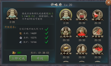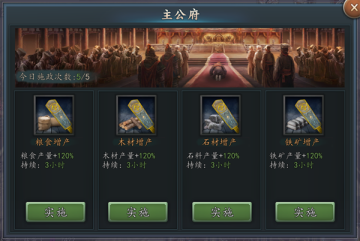 控制其他建筑的开启等级上限,并且可以施行内政,内政的效果为在一段时间内提升粮食、木材、铁矿或石材任意一项的产量,提升主公府等级可以加强施政的效果和解锁更多的建筑物