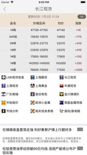 2、随时随地查看期货行情,如LME、沪铜、沪锌、螺纹、铁矿石、焦煤等期货交易品种合约;