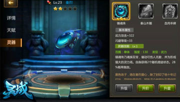 除了升级,灵器还可以通过升星和升阶这两种方式来加强。所有灵器初始都是1星,最高可以升到5星,星级越高实力越强。升星需要消耗血灵液等2-3种升星道具,灵器升星后会提升武者基础属性的成长值以及灵气技能的释放概率。而升阶则需要消耗4种专属进阶道具,升阶后会加强武者基础属性的提升以及灵气技能的强度。灵器对于武者的战斗力能够起到至关重要的作用,因此,努力提升灵器的品质才是制胜之道。