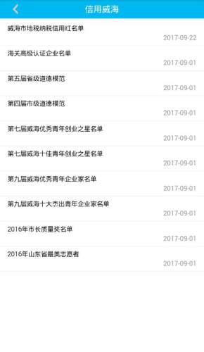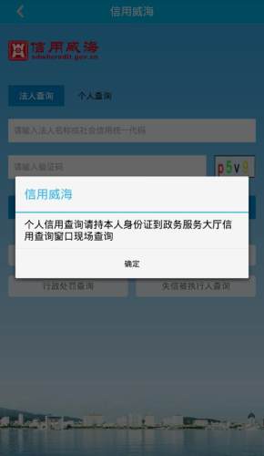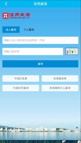 信用威海app是威海市公共信用信息平台,软件拥有法人查询,个人查询,红黑名单查询,行政处罚查询,失信被执行人查询等诸多功能,需要的朋友欢迎下载使用。