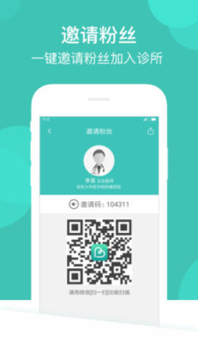 6、医生专属名片及分享功能:医生注册后将获得包含二维码及医生号的专属名片,同时可分享名片至微信好友或朋友圈。
