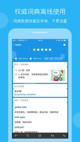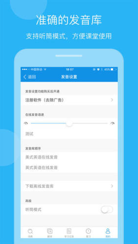 纯正发音:单词、例句支持美音、英音自由切换,带您领略地道英语。