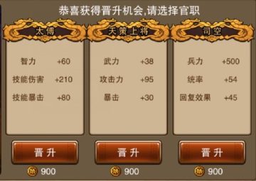 当官职达到10级后便可以晋升更高阶的官职,晋升时我们会提供3条路线给玩家选择,以下是不同路线带来的属性加成: