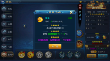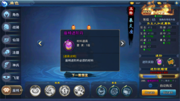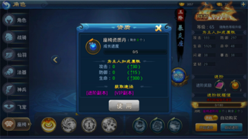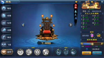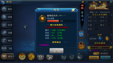 在座椅升级到四阶后,可以开启座椅成长系统。座椅阶数越高,成长等级上限越大。使用座椅成长丹可以升级成长等级,成长等级升级后会增加百分比属性,同时增加人物属性。