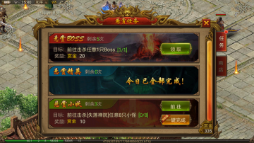 任务分悬赏BOSS,悬赏精英,悬赏小妖3种,根据提示击杀对应数量的怪物后即可获得悬赏积分奖励,获得的积分可在悬赏商店中换取各类材料。