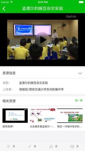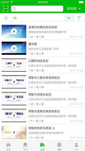 ③资源模块:点击页面最下面一排主模块菜单的【资源】,进入分为学科类和特色类资源,点击页面上方向下的箭头可选择查看学科类或特色类资源。学科类包含视频、文档、测验、题库。