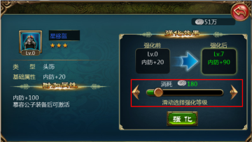 所有装备均可以通过游戏内产出的银两进行强化,强化100%成功。并可通过移动滑块,选择需要强化的等级: