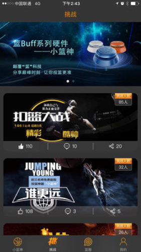 专为篮球爱好者打造的,用于学习和交流的移动app。应用功能包括使用小篮神进行投篮数据收集,参与挑战,发布动态等,用户可以在平台上用小篮神记录自己在篮球场上的点滴,并发布视频或者照片展示自己,也可以从球星或老师那学习篮球技术和知识。