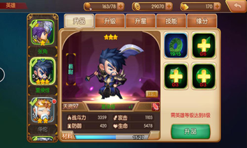 通过主页面左下角进入英雄界面,对英雄进行培养。培养英雄主要分为四部分,升品、升级、升星和技能。