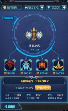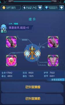 提升:有4个装备,并且可以对战机升级和升阶。点击装备图标,可以查看装备信息,并能对装备进行更换,升级,进阶,强化等操作