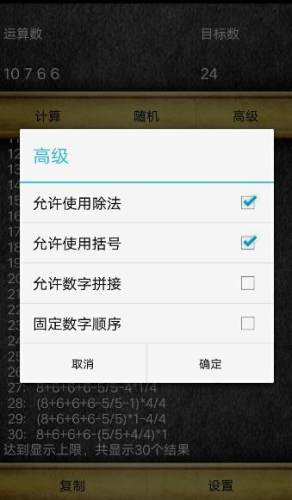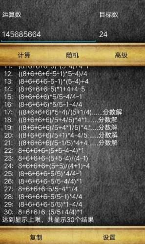 2.运算数与目标数均可为任意指定的整数、小数、分数、负数或四则运算式!还可以自定义规则,限制除法或括号的使用、允许数字拼接或规定数字在算式中出现的顺序。