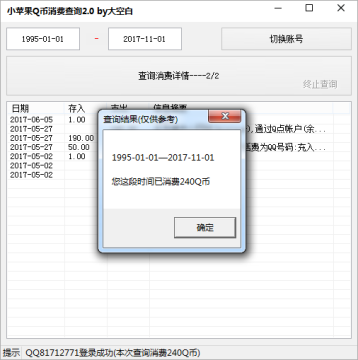 小苹果q币消费查询是一款查询qq总消费记录的软件,无论你玩的是电脑游戏或者是手机游戏,只要是腾讯的游戏就行,ta可以查询你充值QB的总数量,快来看一看你为腾讯做过多少贡献吧!