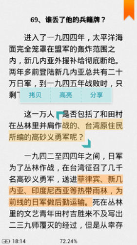 5 支持书签,高亮显示(PS:目前还不支持笔记,但后续会继续增加该功能,我们一定会以“下定决心,不怕牺牲,排除万难,去争取胜利”的心态为更多书友服务);