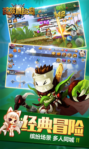 《超级冒险岛》是一款Q萌横版过关动作手游。游戏以2D横向卷轴方式呈现神秘的冒险世界。游戏中角色可以穿戴多样化的装备、使用自由组合的技能进行战斗历险,并可自由的跳跃、攀爬甚至飞翔。上百精灵宠物与玩家并肩作战,超过50种时装、30种翅膀可供个性装扮。在这里每一个玩家都是独一无二的主角。
