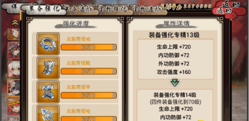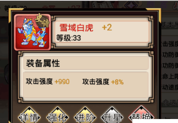 装备专精:这个是最容易被忽视的一个提高战力的方式,包含装备强化,装备进阶,宝物强化,宝物进阶四个方面。