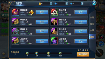 点击界面上方的副本即可快速传送至任意副本,副本根据产出物不同,分为金钱、经验、道具三类。