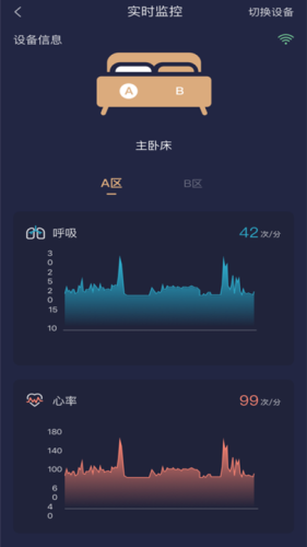 展示了丰富的实时监控数据,里面划分了主卧床中的A区与B区,能看到各种监控数据图;