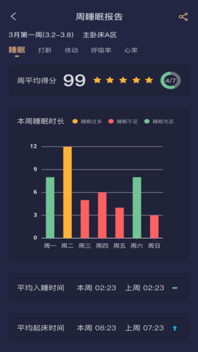 周睡眠报告中拥有清晰统计图,能看到图上显示的柱状睡眠统计对比情况。