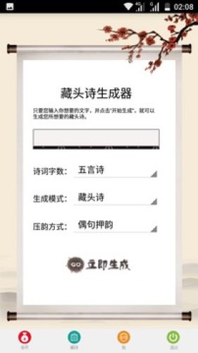 墨芳藏头诗app是一款诗词自动生成工具,只要您输入你想要的文字,并点击“开始生成”,就可以生成您所想要的藏头诗。提供藏头诗、藏尾诗、名字作诗,生日诗,爱情诗在线生成服务。