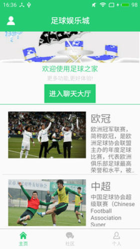 足球娱乐城是一款包涵世界杯、欧洲杯、英超、西甲、欧冠、中超等足球精彩赛事资讯、了解足球赛事资讯,可以在聊天大厅讨论足球,加深对足球的了解,欢迎体验使用