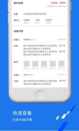 用户登录后可实时查看与自己相关的各个阶段的任务及任务的处理详情,方便快捷的跟进了解所有任务的进度情况,以提高线上完成任务的效率。