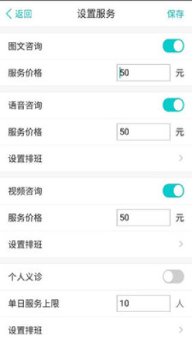 2、服务设置:可通过图文、语音、视频方式回复患者的线上咨询,可以开通/关闭,设置价格。家庭医生是以月为单位为购买患者提供60次图文咨询和10次视频看诊。