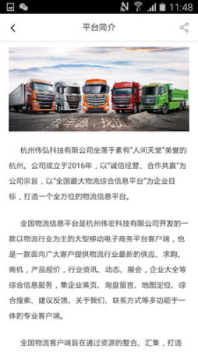 全国物流信息平台创新物流生态链与供应链的互联网物流企业。是基于移动互联网技术开发的物流信息手机APP应用商品,致力于为公路运输物流行业提供高效的管车配货工具,同时为货源信息发布、预约车辆、司机接单提供全面的信息及交易服务!