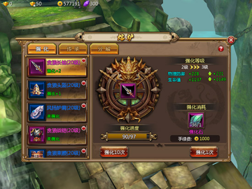 装备强化时,强化石固定可以增加50点装备经验,强化石可在辱楼幻境副本中获取。装备强化获得的加成属性,与装备固有的属性有关,所以前期优先强化武器、衣服、裤子等基础属性值较高的装备部位,装备最高可以强化到20级,在强化时有几率发生2倍、4倍、8倍的暴击!