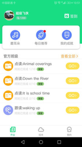 超级绘本是一款拥有海量英语学习绘本、可实现智能英语测评服务的少儿英语学习软件。功能包括磨耳朵模块、考勤管理、自主完成绘本学习、教师发布作业完成提交;软件集成了科大讯飞语音测评服务,为用户提供最精确的英语发音解析。