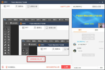 (1) 点击页面上部的“屏幕分享”按钮,即可切换到屏幕分享上课界面(此时,上课模式还是之前的上课模式),如下图所示: